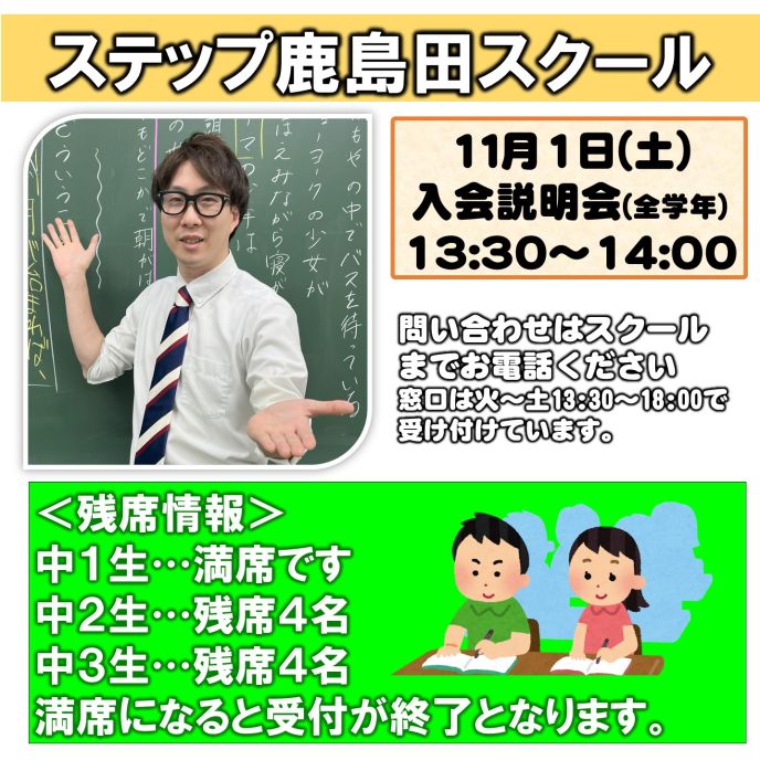 ・11月8日(土)13:30~14:00で実施(小5~中2対象)※冬期講習説明会となります。