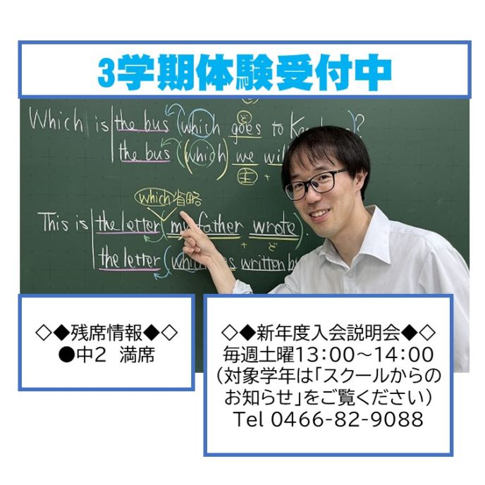 新年度の入会に関する説明をいたします。ご検討されている方はぜひご参加ください。現小5~中2の方で3学期からの入会をお考えの方もこちらにご参加ください。無理な営業は一切行いませんので、お気軽にお越しください。