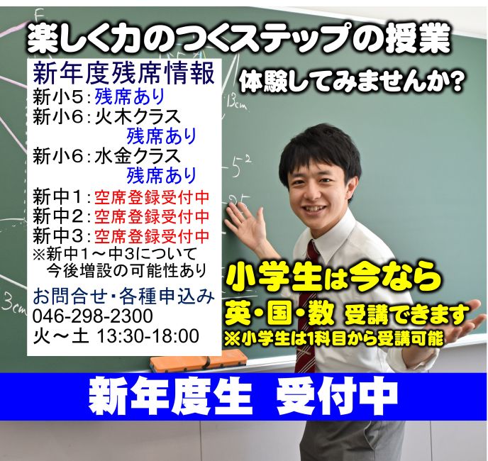 現在満席の小6、中1、中2では空席登録を受け付けています。各学年空席登録が10名程度いらっしゃいます。
