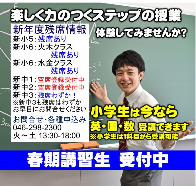 現在、新小5、新小6は全科目受講できます。お早めに入会をご検討ください。