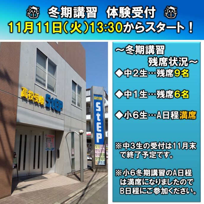 ◆現在、冬期講習の体験生を受付ています。この機会に、ステップの授業に参加してみませんか?各学年の復習をして、一緒に弱点を強化しましょう!