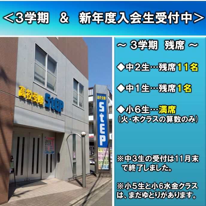 また、新中2生(現中1生)は残席が1名のため、中3生の受験が終わった後、クラスを増設する予定です。なお、1月10日(土)14:00から入会受付を始めます。ぜひ、この機会にお越しください。