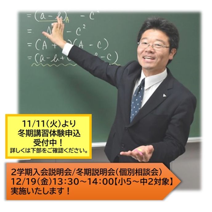 以下の日程で2学期入会説明会/冬期説明会(個別相談会)を実施いたします!現時点で満席の学年もございます。入会をご検討中の方はぜひお早めにご参加ください。