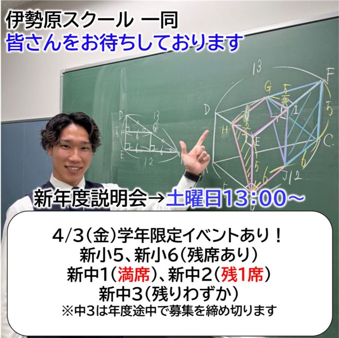 4/3(金)新中3限定説明会(外部生対象)→17:00~18:00