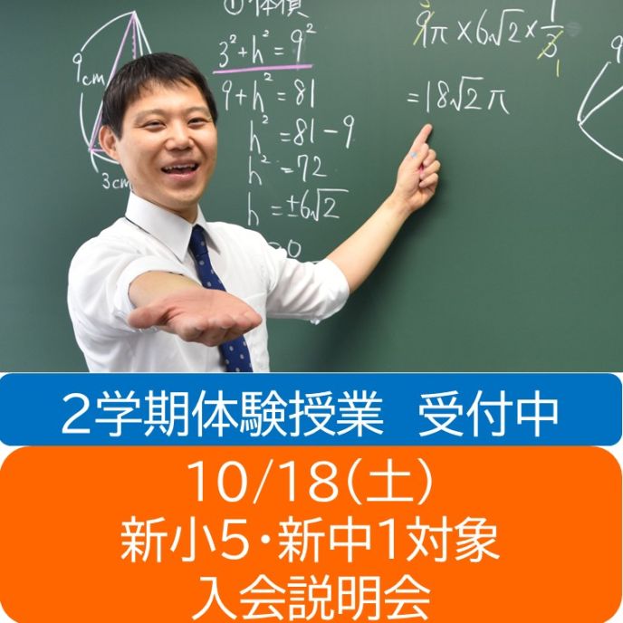 体験授業を受付中です。現在中2生は満席です。中1生、小学生の方は満席になる前に、ぜひご入会をお勧めいたします。満席に近い学年もありますので、お問い合わせください。
