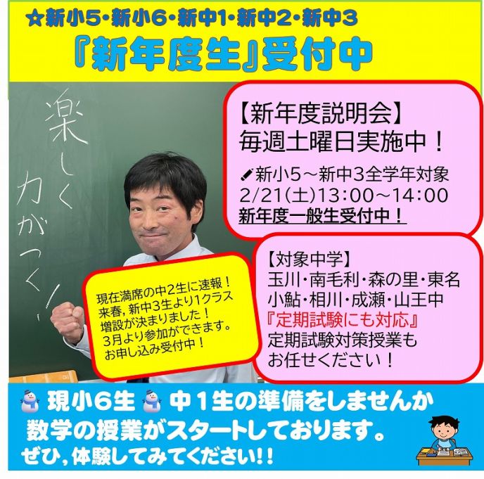 ※(新中3生)3月より1クラス増設いたします。