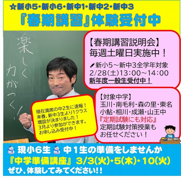 小5・小6・中1生の塾生の春期講習費は無料です。