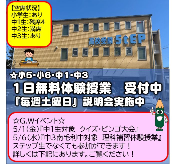 ※ステップ生でない生徒は,お電話にてお申し込みください。