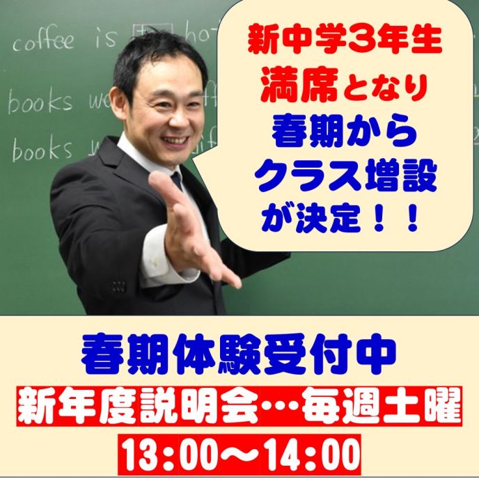 ●新中3(現中2)は満席となり、春期講習から1クラス増設することになりました。