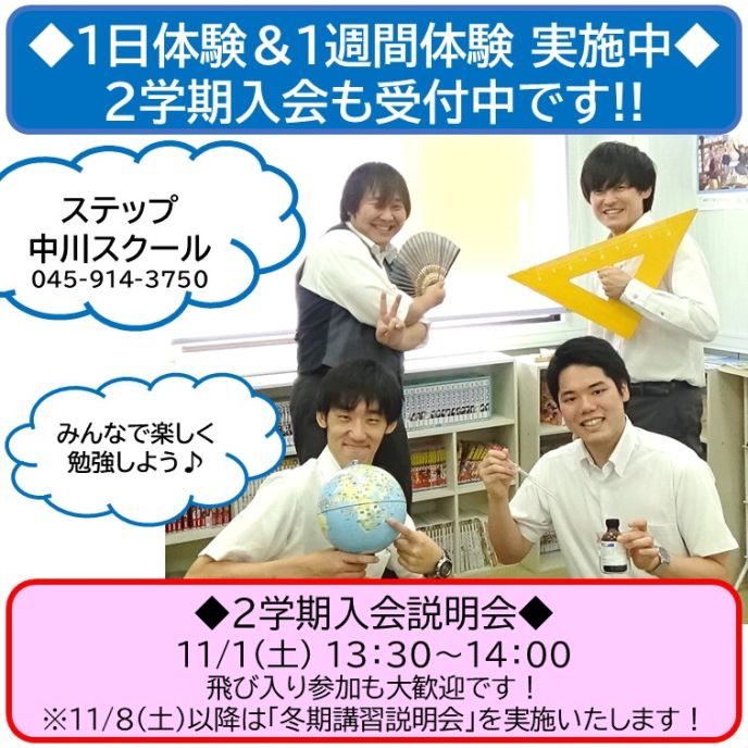 11/1(土) 13:30~14:00 で2学期入会説明会を実施致します!飛び入り参加も大歓迎です!ぜひスクールまでお問い合わせください!