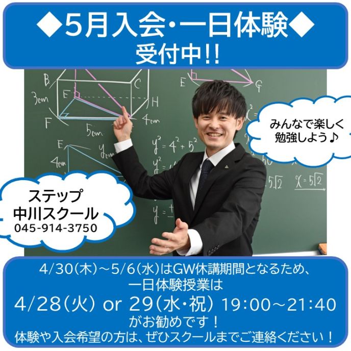 ※4/30(木)~5/6(水)は休講期間となるため、一日体験は4/25(土)・28(火)・29(水・祝)がお勧めです!