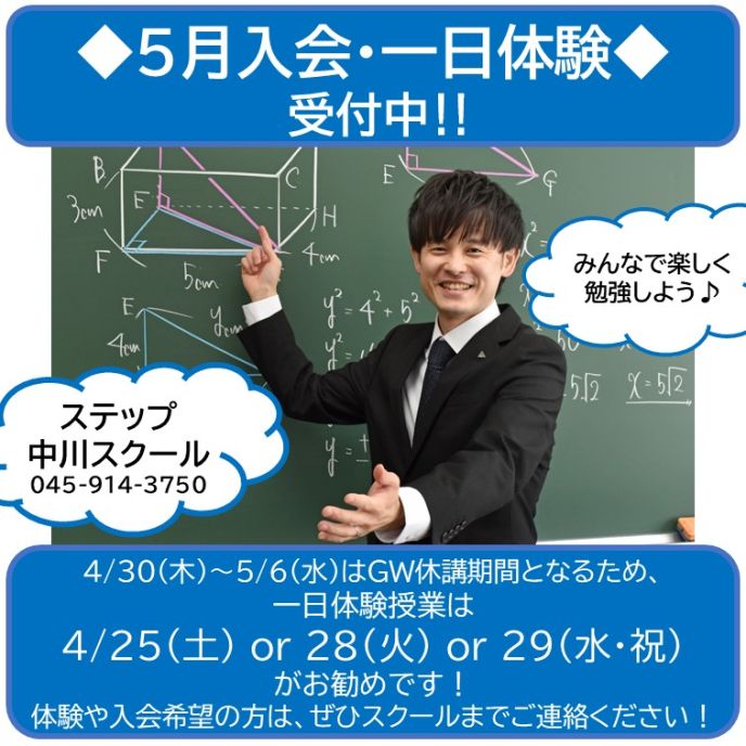 ※4/30(木)~5/6(水)は休講期間となるため、一日体験は4/25(土)・28(火)・29(水・祝)がお勧めです!