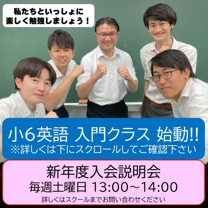 3学期からスタートする英語入門クラスを設置しました。英語入門クラスとは、「小学校の英語が良く分からない」「今まで小学校以外で英語を習ったことがない」「英語を1から学びたい」という方向けのクラスです。中学生になり、英語が苦手になってしまう生徒もいますが、小6生のうちに先取をしておくと、断然有利になります。中学入学前に、中1内容を勉強していきましょう! 詳しい内容はスクールまでお問い合わせください。