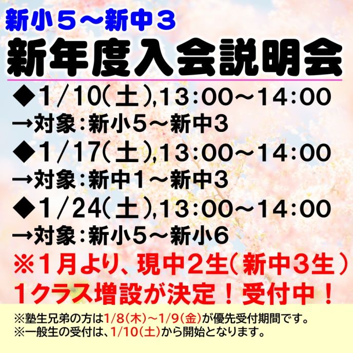 ◎1/17(土) 入会説明会 新中1~新中3対象(60分)